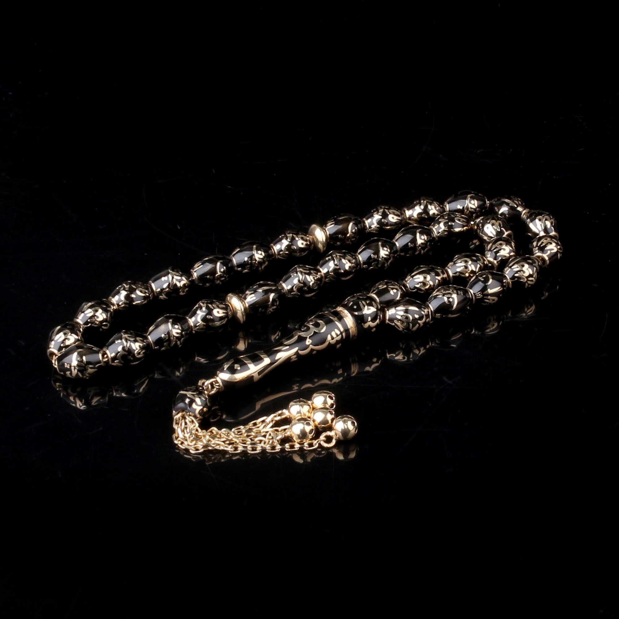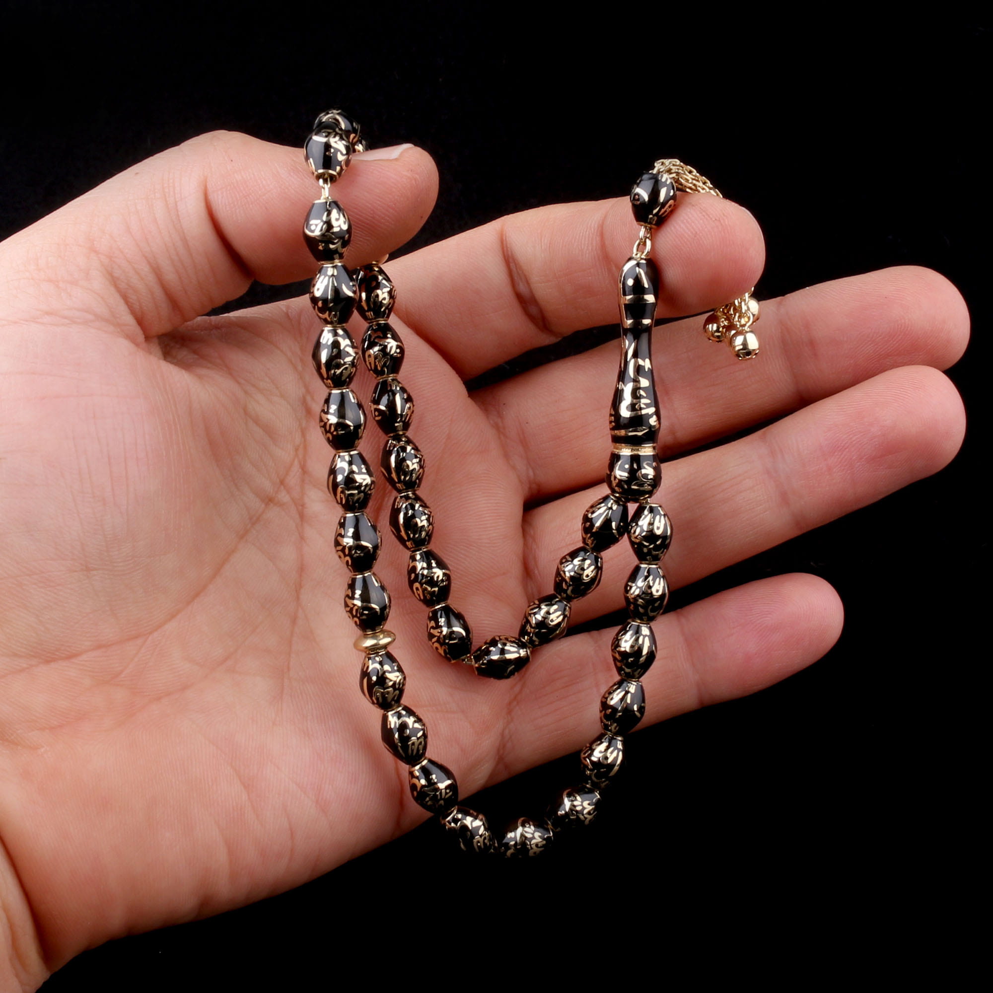 Hat İşlemeli Siyah Mineli Altın Tesbih