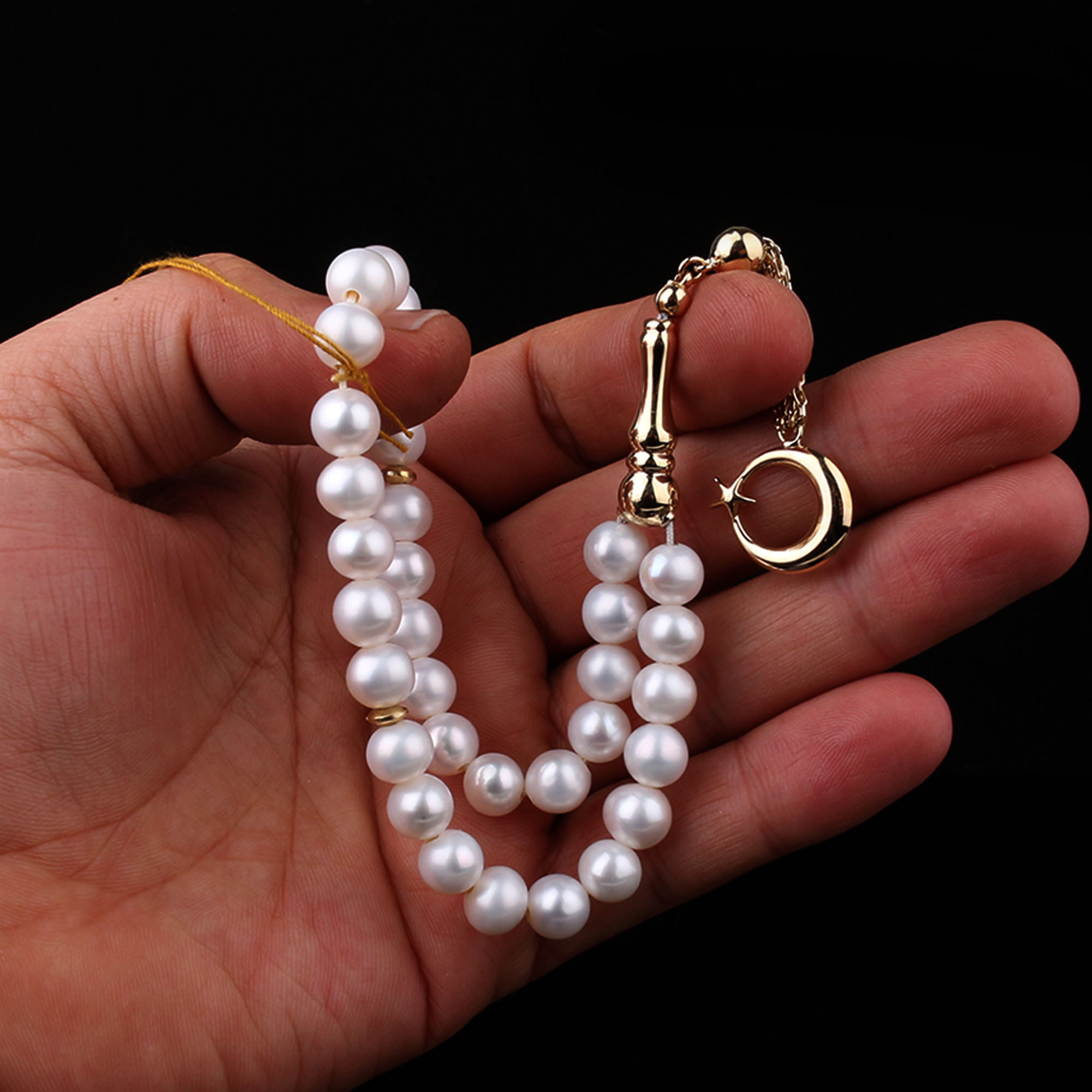 Orijinal İnci Taşlı Ay Yıldız İmame Detaylı Altın Tesbih